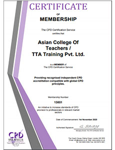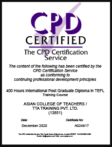 The globally renowned CPD Certification Service UK has certified ACT’s major courses – International Teaching Diploma, TEFL, Special Educational Needs, Education Administration, Management & Leadership and Train the Trainer, conforming to the continuing professional development principles based on the values of British and European standards. This means that the learning activities have reached the required Continuing Professional Development standards and benchmarks as per CPD guidelines.