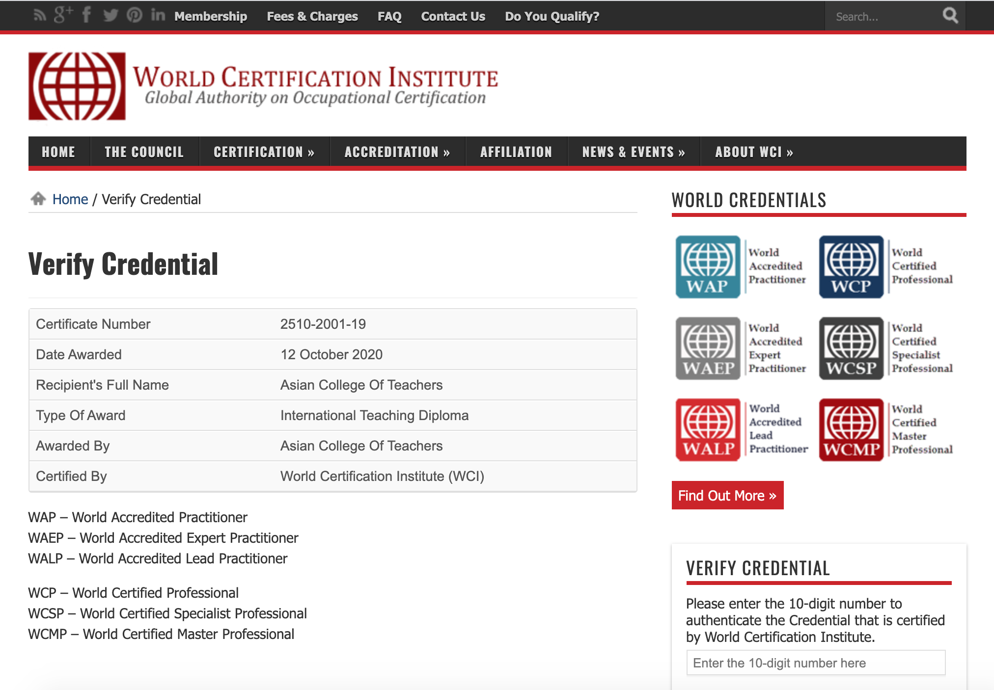 Students graduating from ACT’s ITD course can verify WCI’s Credential Award at WCI home page under “VERIFY CREDENTIAL” by keying in the 10 digits assigned to the Credential Award. https://www.worldcertification.org/