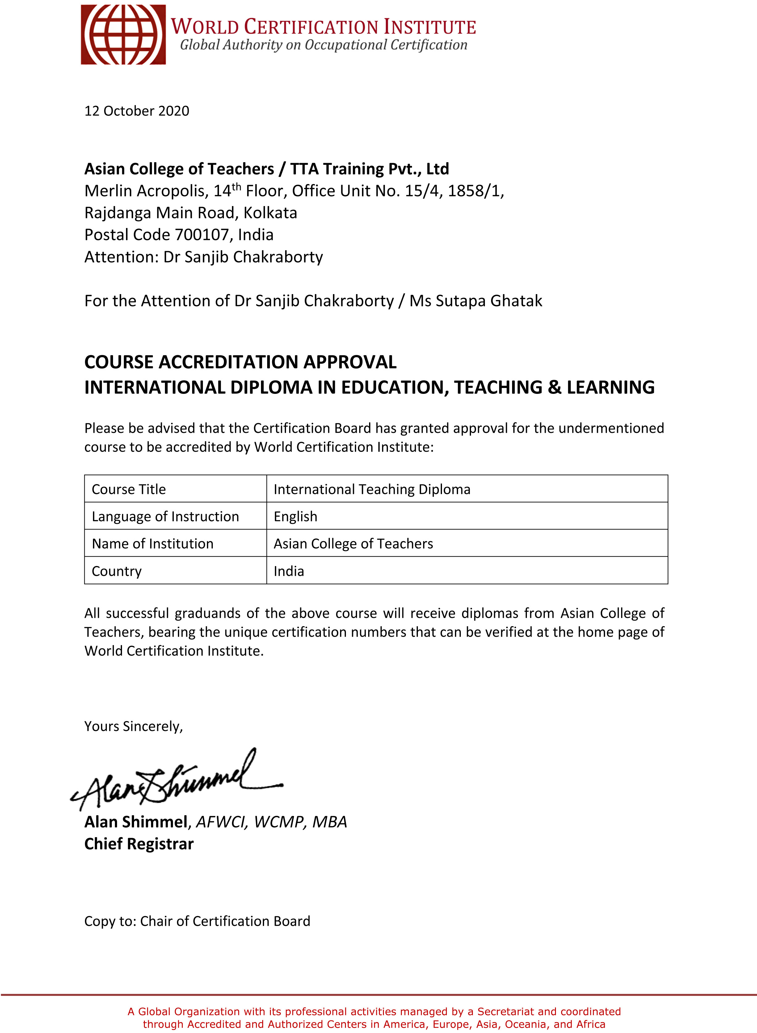 We at Asian College of Teachers (ACT) aspire to advance teaching and learning with a core purpose to make teacher education accessible to every corner of the globe. We strive to provide new knowledge and academic solutions to make a positive impact on teacher education and beyond. In a bid to impart quality training and build academic excellence, ACT collaborates with global accrediting bodies to meet the growing expectations of the students we educate. We are proud to share that World Certification Institute (WCI)has given accreditation to our International Teaching Diploma (ITD) course to provide the best in pre-primary training.